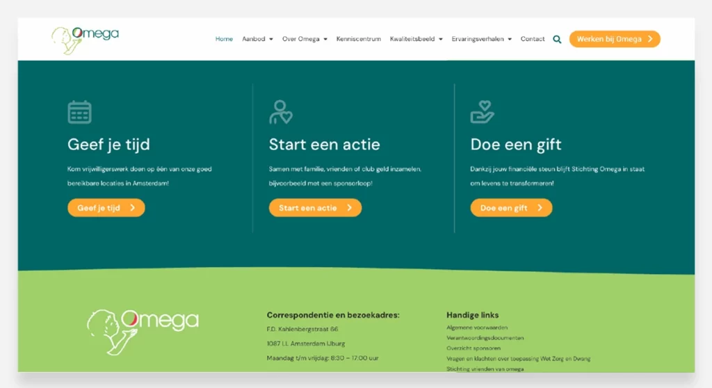 We brachten de twee websites samen onder één paraplu, binnen een toekomstbestendig WordPress–Elementor-framework met een maatwerk ontwerp. Zo ontstond een gebruiksvriendelijke, toegankelijke website die voldoet aan de laatste richtlijnen, en waar storytelling centraal staat. Want de verhalen van ouders, begeleiders en vrijwilligers geven de website warmte en diepte, en brengen de missie van Omega tot leven! En ook belangrijk: ze doen het ook allemaal samen.