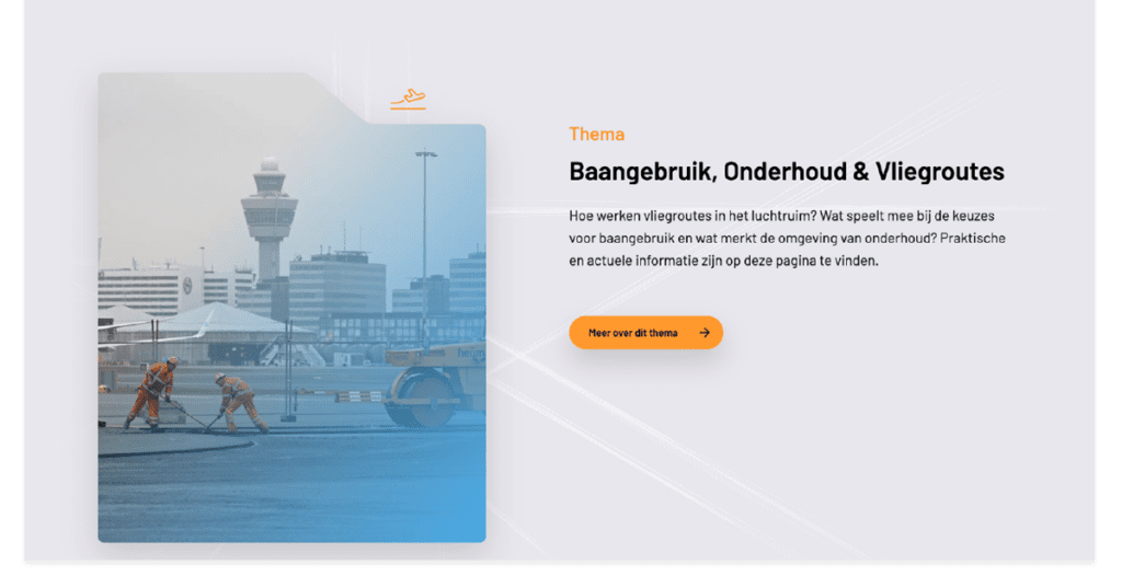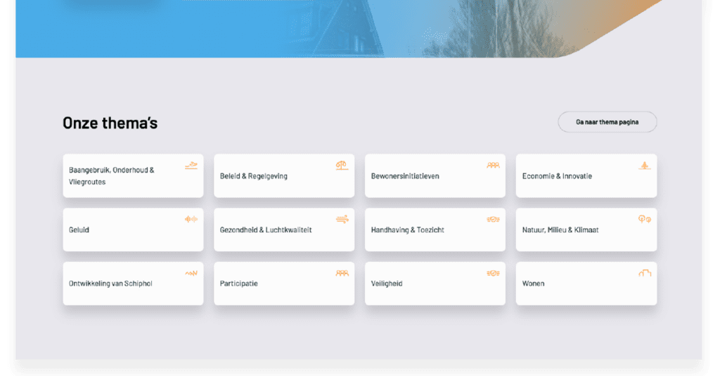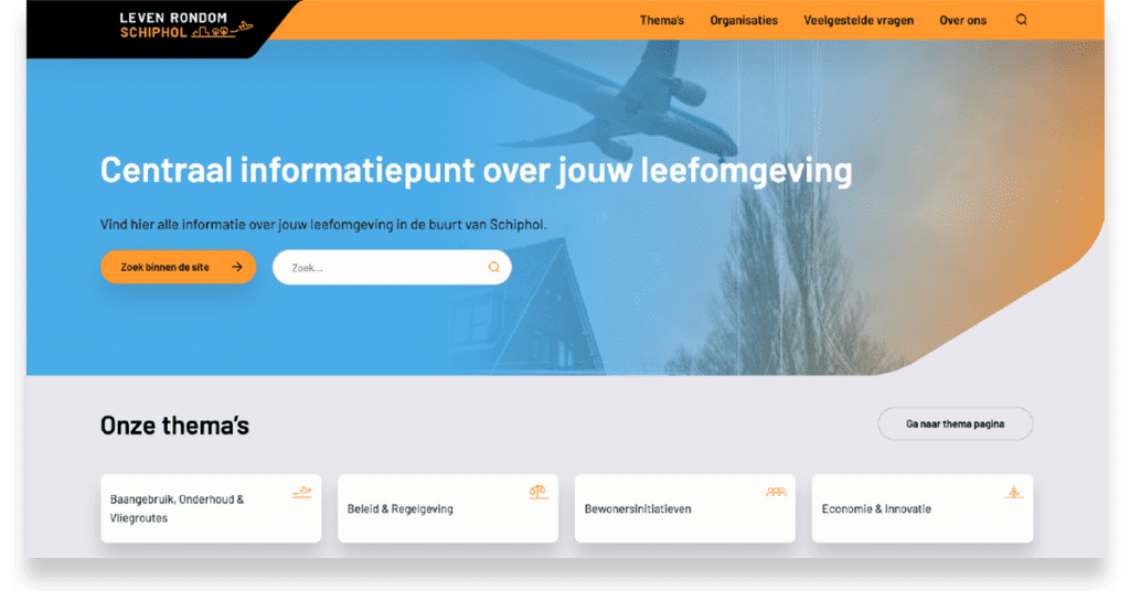 Zijn advies was: maak één plek waar alles samenkomt. Het Ministerie van Infrastructuur & Waterstaat en de Maatschappelijke Raad Schiphol vroegen Blue Field Agency en ons om dat idee te vertalen naar een gebruiksvriendelijke, overzichtelijke website. Een plek waar omwonenden gewoon terecht kunnen als ze iets willen weten over geluid, luchtkwaliteit, veiligheid of vliegverkeer.